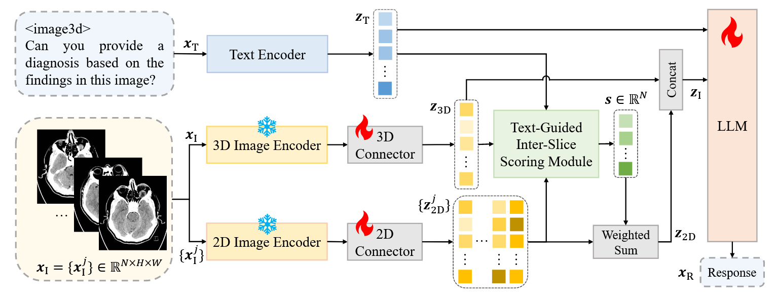 we propose Med-2E3, a novel MLLM for 3D medical image analysis that integrates 3D and 2D encoders. To aggregate 2D features more effectively, we design a Text-Guided Inter-Slice (TG-IS) scoring module, which scores the attention of each 2D slice based on slice contents and task instructions.