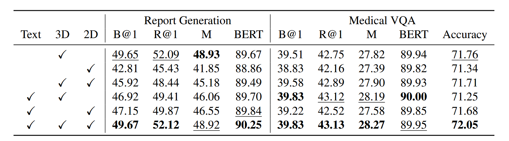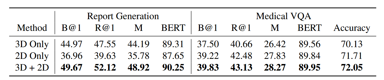 表中可以看出,综合使用了3D编码器和2D编码器进行特征提取的Med-2E3在报告生成和医学VQA俩个任务上都取得最好的性能。此外,表中还有俩个现象。其一是在报告生成任务上只使用3D编码器和效果要优于只使用2D编码器的效果;其二是,在医学VQA任务上只使用2D编码器的效果要优于只使用3D编码器的效果。作者认为前者是因为本文使用的3D编码器预训练时接受的是医学报告类似的数据,所以在报告生成任务上效果更好,而后者是因为VQA任务比较简单,2D编码器在自然图像中预训练,其足够鲁棒到处理医学VQA任务。