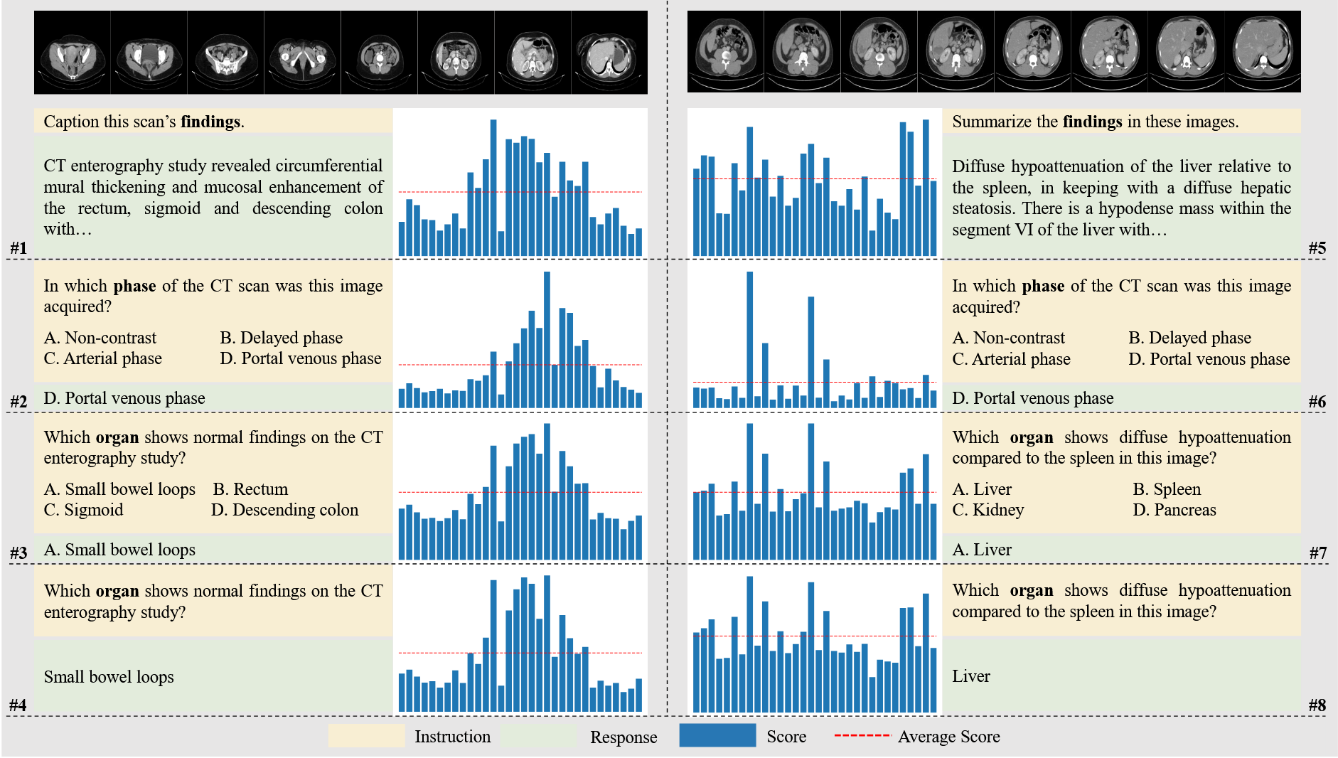比较问题1和问题2,或比较问题5和问题6,我们发现相同的CT图像在不同的问题中,模型对每张切片的注意力分数分布是显著不同的,这说明表示注意力分数由任务说明指导,与我们的设计一致。。