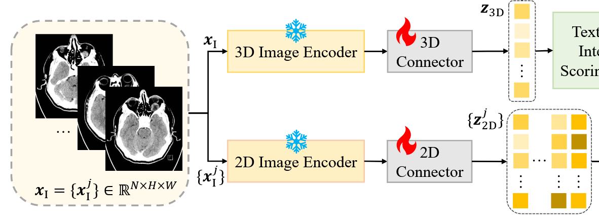 ✨ 我们设计了一个文本引导切片间(TG-IS) 评分模块,以模拟放射科医生在3D医学图像分析中使用的注意力机制。该模块根据切片内容和任务说明对每个切片的注意力进行评分。
