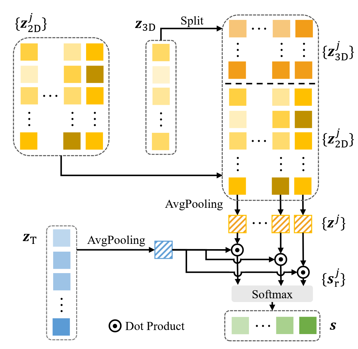 通过TG-IS,我们已经获得了每个切片的注意力分数$\boldsymbol{s}$,接下来我们需要利用该注意力分数来聚合2D特征$\{z_{2D}^j\}$,即使用加权求和: