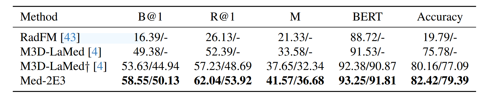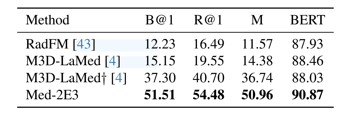 可以看出,本文的Med-2E3在M3D-Cap和M3D-VQA上均取得了最好的结果,其中†表示该实验结果是通过开源代码复现的,没有该标记则直接使用别人的实验数据。