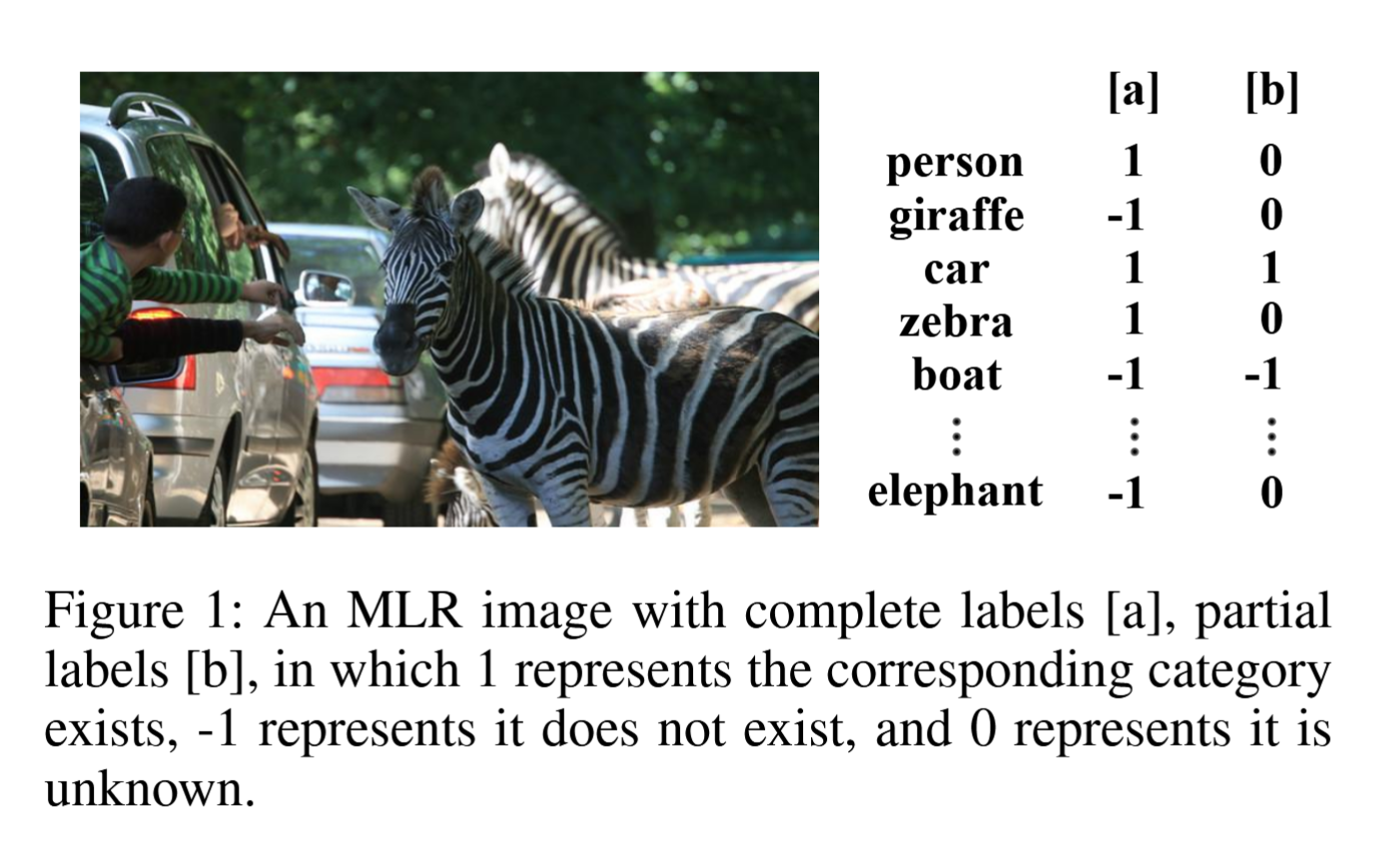 段落一:引入部分标注的多标签分类任务的重要性:多标签图像识别(MLR)旨在从输入图像中提取所有语义标签,相较于单标签任务,MLR是一个更具挑战性和实用性的任务。由于输入图像和输出标签空间的复杂性,收集具有完整多标签注释的大规模数据集非常耗时。为了解决这个问题,近年来的研究趋向于研究部分标签的多标签图像识别任务(MLR-PL),在该任务中,仅提供少数正标签和负标签(标注为1或-1),而其他标签未知(见图1,标注为0)。MLR-PL更贴近实际场景,因为它不要求每张图像都拥有完整的多标签注释。