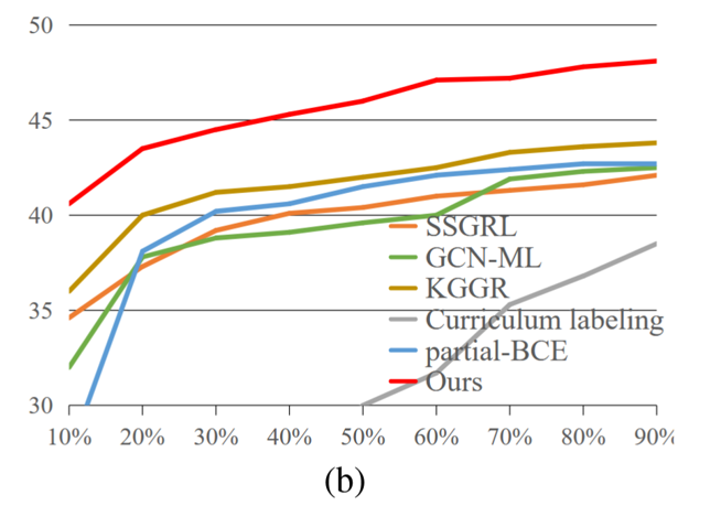 值得注意的是,当已知标签比例降低时,SARB 框架的性能提升更为明显。(如图)例如,当使用 90% 和 10% 的已知标签时,mAP 与之前的最佳 KGGR 算法相比分别提高了 1.4% 和 4.6%。