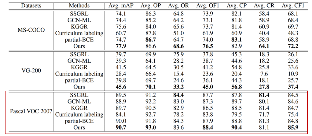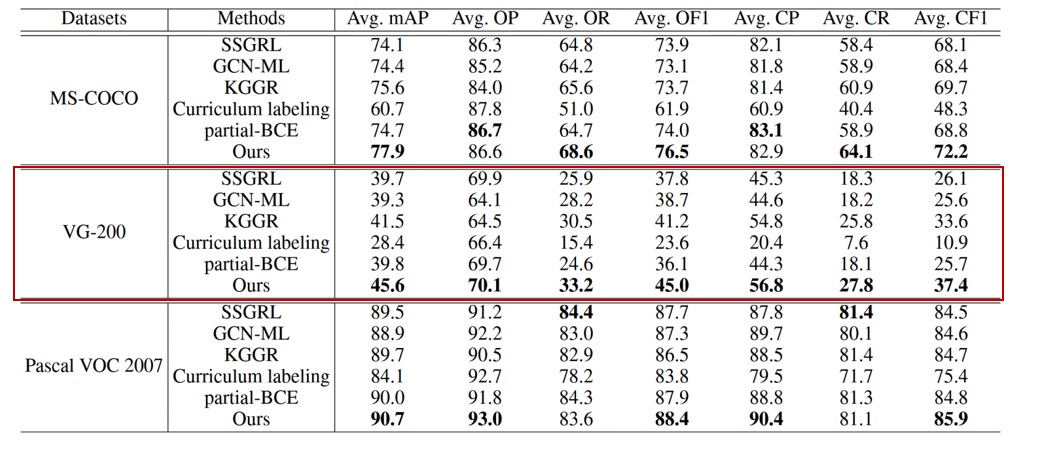 所有的数据集均具有完整标注。为了模拟部分标注,参考前人工作 (Durand et al. 2019; Huynh & Elhamifar 2020):随机丢弃部分正负标签,制造“部分标注”数据集。在这项工作中,丢弃标签的比例从 90% 到 10% ,因此已知标签的比例为 10% 到 90%。为了进行公平的比较,我们采用了所有类别的平均精度(mAP)来评估不同比例的已知标签。为了进行更全面的评估,我们还计算了所有比例的平均 mAP。此外,我们还遵循之前大多数 MLR 作品(Chen 等人,2019b)的做法,采用整体(overall)和每类(per)精度、召回率、F1-measure(即 OP、OR、OF1、CP、CR 和 CF1)进行更全面的评估。