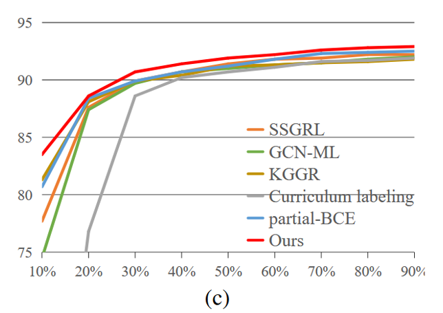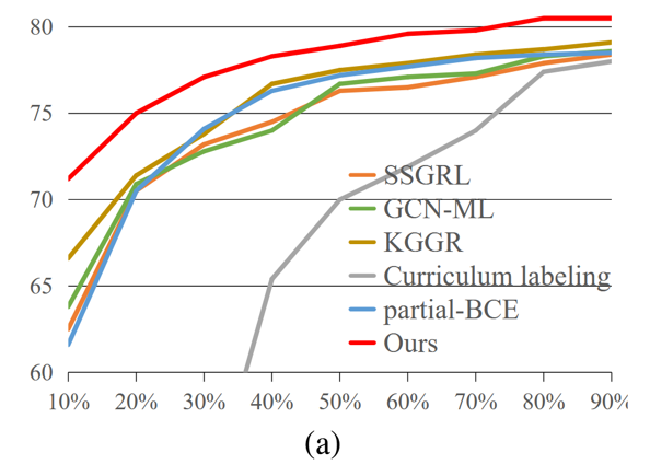 (列数据)如表所示,该算法的 mAP、OF1 和 CF1 平均值分别为 77.9%、76.5% 和 72.2%,比之前表现最好的 KGGR 算法分别高出 2.3%、2.8% 和 2.5%。如图所示,在所有已知标签比例设置中,SARB 框架也能获得更好的 mAP。