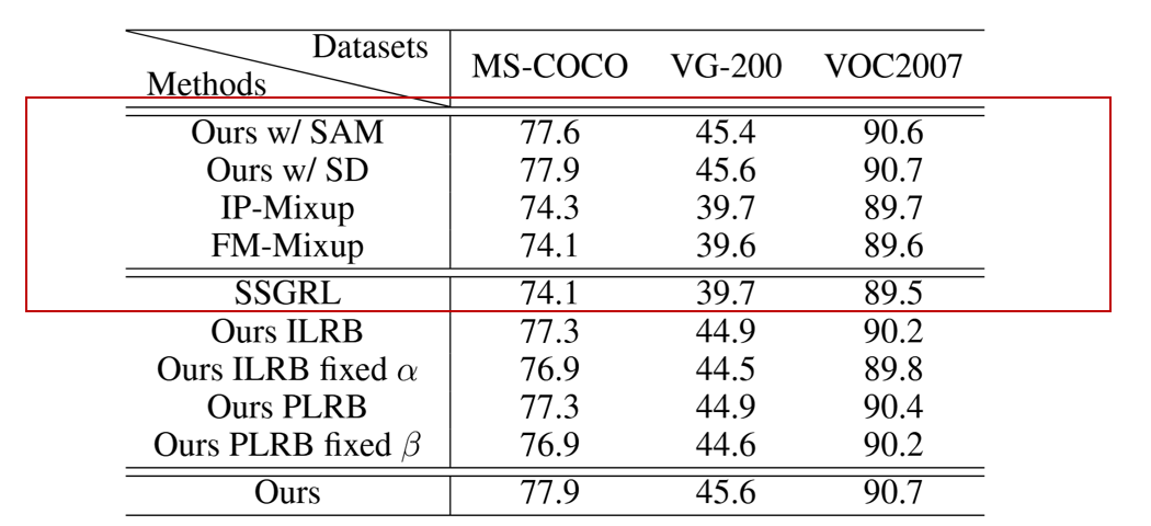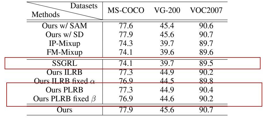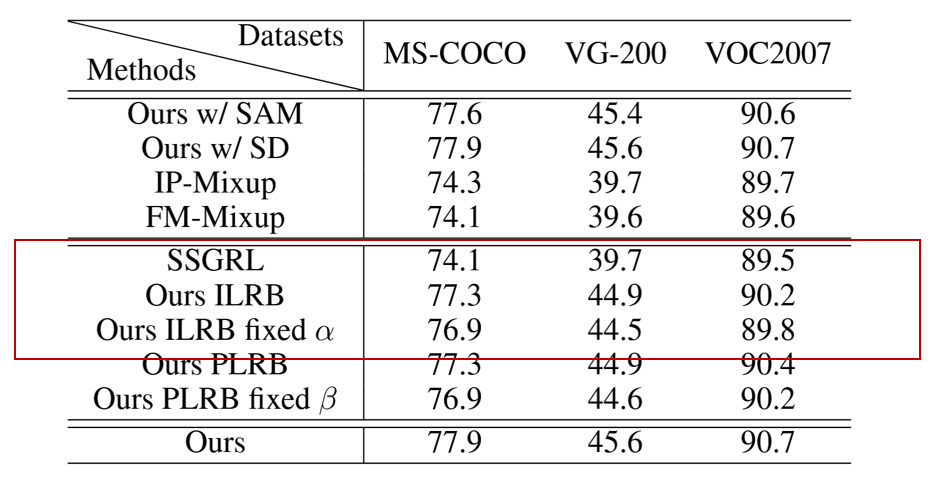 为了分析 ILRB 模块 的实际贡献,作者进行了只使用该模块的实验(称为 Ours ILRB),并与 SSGRL 基线在 MS-COCO、VG-200 和 Pascal VOC 2007 三个数据集上进行了对比。