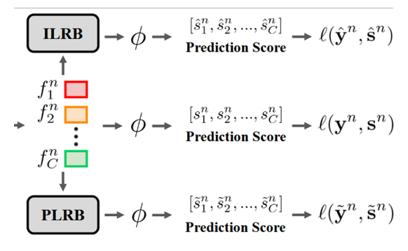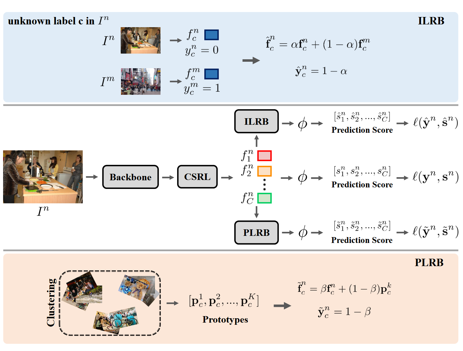 动机:直观地说,图像 $I_n$中的未知标签 $c$ 可能在另一幅图像 $I_m$ 中是已知的。ILRB 模块的目的是将图像 $I_m$ 中标签 $c$ 的信息融合到图像 $I_n$ 中,从而使图像 $I_n$ 也能拥有已知标签 $c$。为了实现这一目的,我们融合了属于同一类别的不同图像的表征,将一幅图像的已知标签转移到另一幅图像的未知标签上。