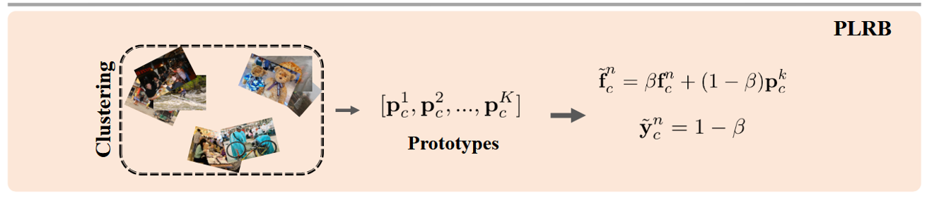 动机:虽然 ILRB 模块可以明显提高性能,但它可能会干扰训练过程,因为它会生成许多不同的融合表示进行训练,尤其是当已知标签比例较低时。针对这一问题,我们进一步设计了一个 PLRB 模块,该模块通过学习为每个类别生成更稳定的表示原型,并将图像 $I_n$ 中未知标签的表示与相应类别的原型进行融合。