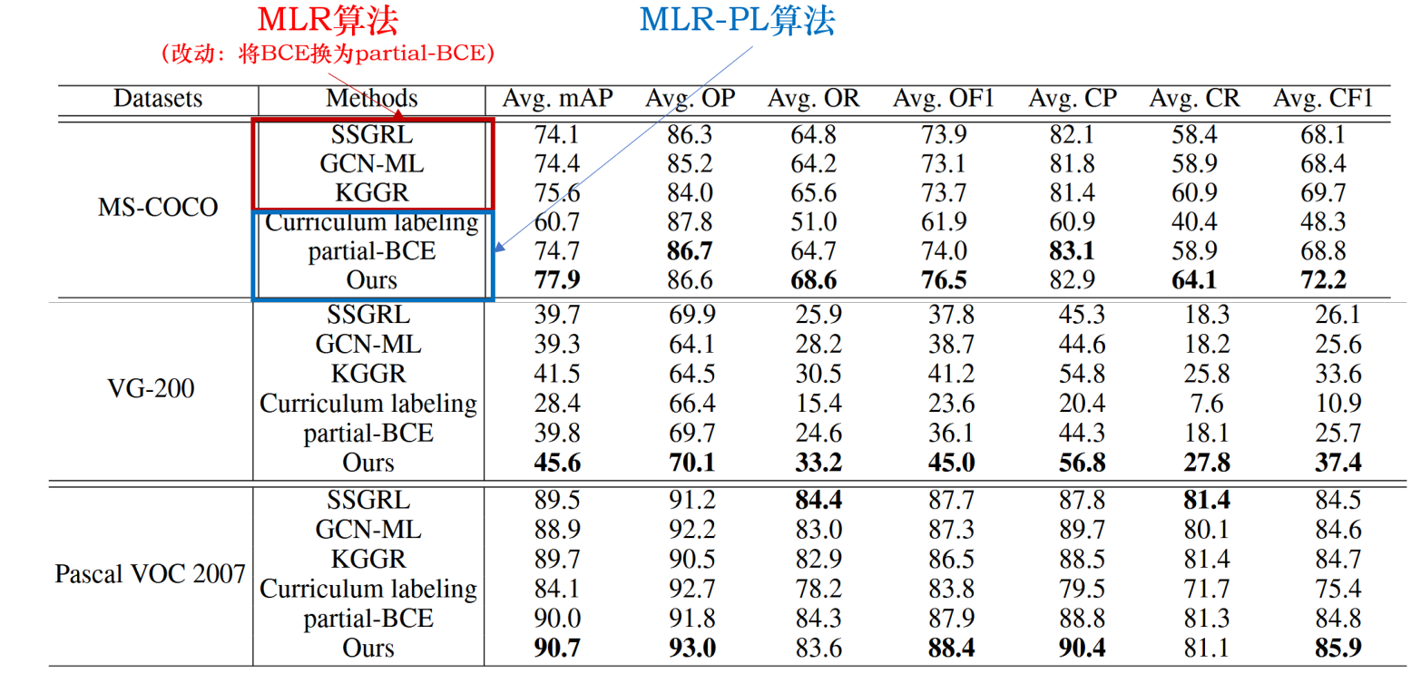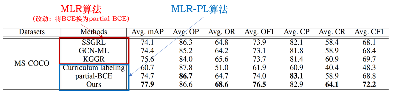 由于MLR算法是无法直接处理未知标签数据的,这里作者统一将MLR算法中的损失修改成部分二元交叉熵损失以进行对比。