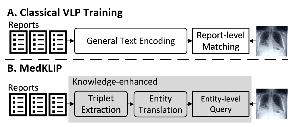 - 【核心坑】现有的医学视觉-语言预训练(VLP)工作 通常采用一种直接的训练范式,即将原始报告与图像扫描匹配,忽略了医学领域的先验知识。