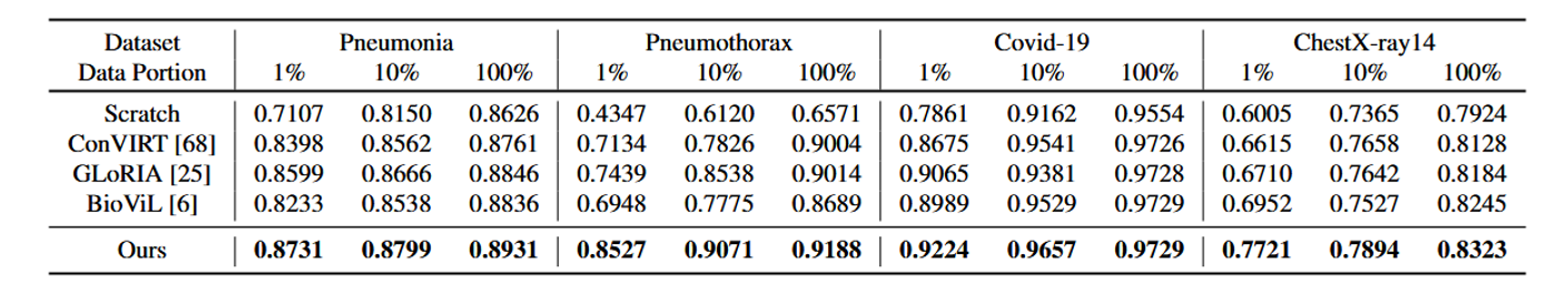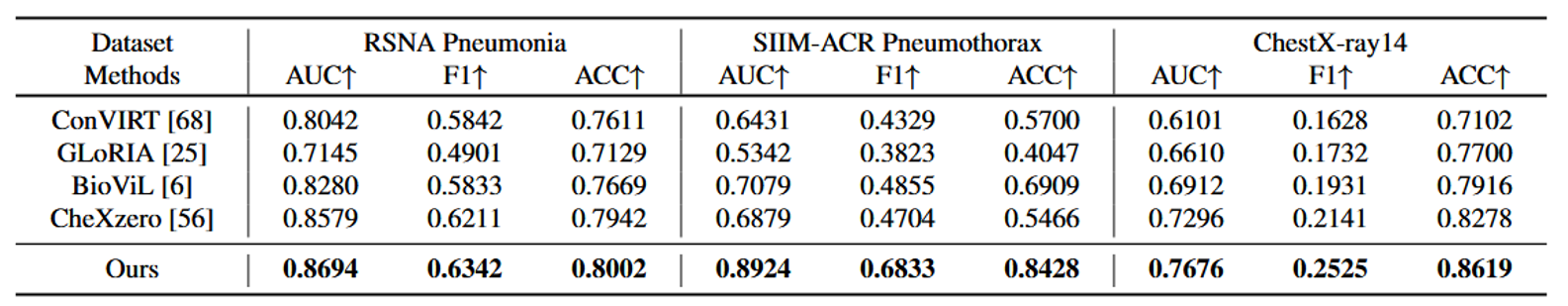 我们与现有的多种最先进的医学图像-文本预训练方法进行比较,具体包括ConVIRT [68]、GLoRIA [25]、BioViL [6]和CheXzero [56]。由于ConVIRT和GLoRIA是在内部数据集上预训练的,为了公平比较,我们在MIMIC-CXR数据集上重新训练了它们的模型。对于BioViL,我们使用作者公开发布的模型。