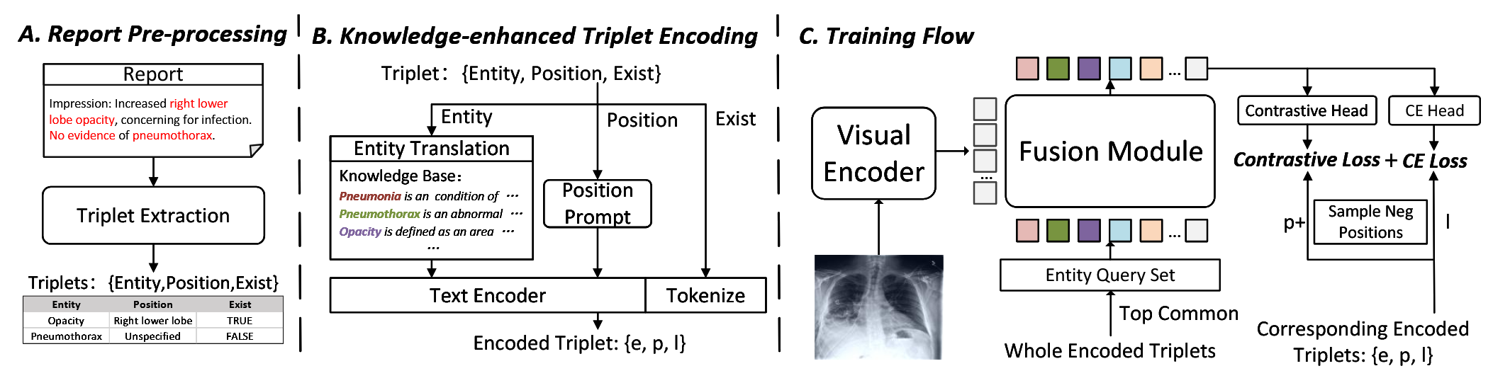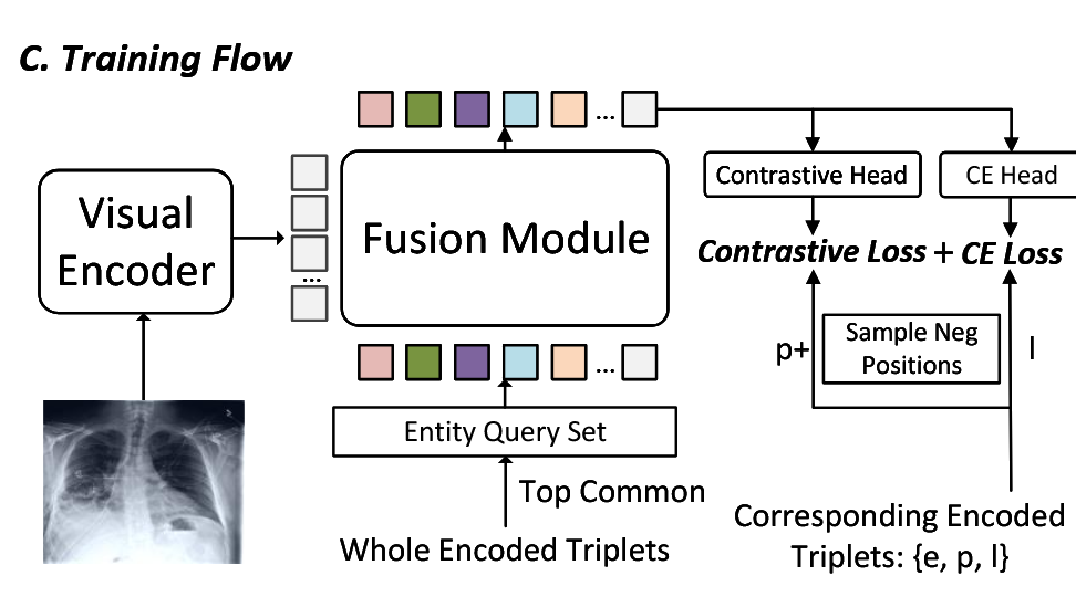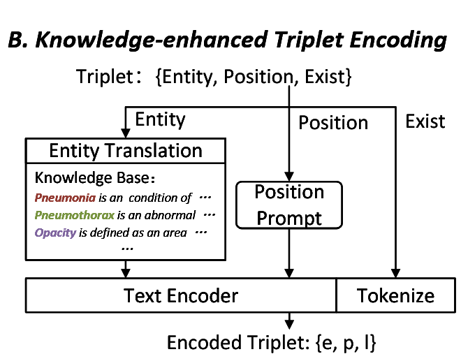 通过报告中的三元组,我们可以在实体级别对模型进行监督,而不是在整个报告级别进行监督。三元组中的“位置”和“存在性”部分可以自然地视为更细粒度的监督标签。