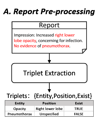 【填坑一】:我们提出了一个三元组提取模块,用于从原始报告中提取有用的医学实体,并将每个报告简化为一组三元组,表示为 {实体, 位置, 存在性}。将报告分解为三元组可以有效表示报告内容,同时由于报告结构的先验知识,信息损失最小。