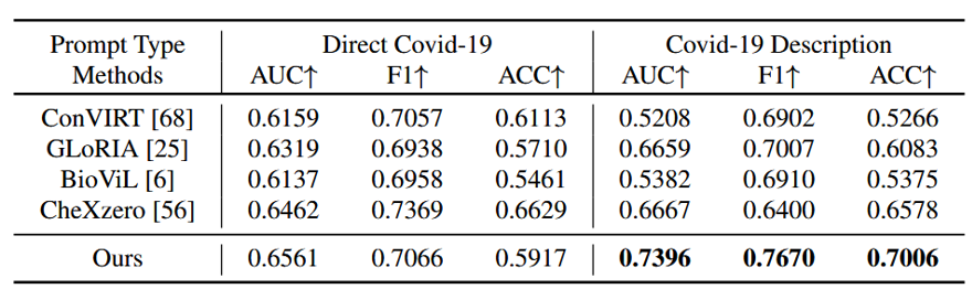 在零-shot设置下,我们使用BioViL [6]中提到的提示,并与最近的方法(CheXzero [56])进行比较,后者在零-shot诊断能力上已被证明优于放射科医生。
