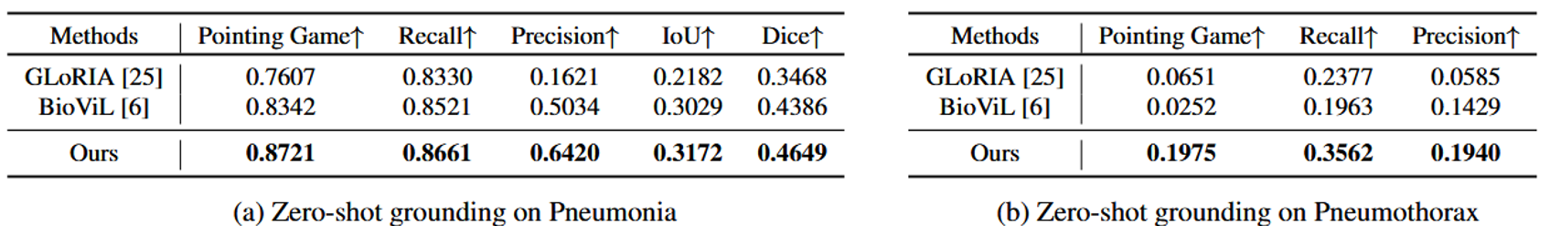 在不同疾病的零样本分类和定位任务中,我们的模型在不同图像分布下表现出最先进的性能,并且通过进一步微调,模型的性能仍显著超越了之前的模型。