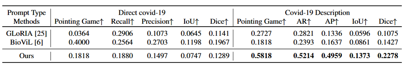 未见疾病:我们还对未见疾病——即COVID-19进行了零-shot基础定位实验,如表4所示。我们的模型在所有指标上均表现出一致的提升,例如,指示游戏得分从0.40提升至0.58。